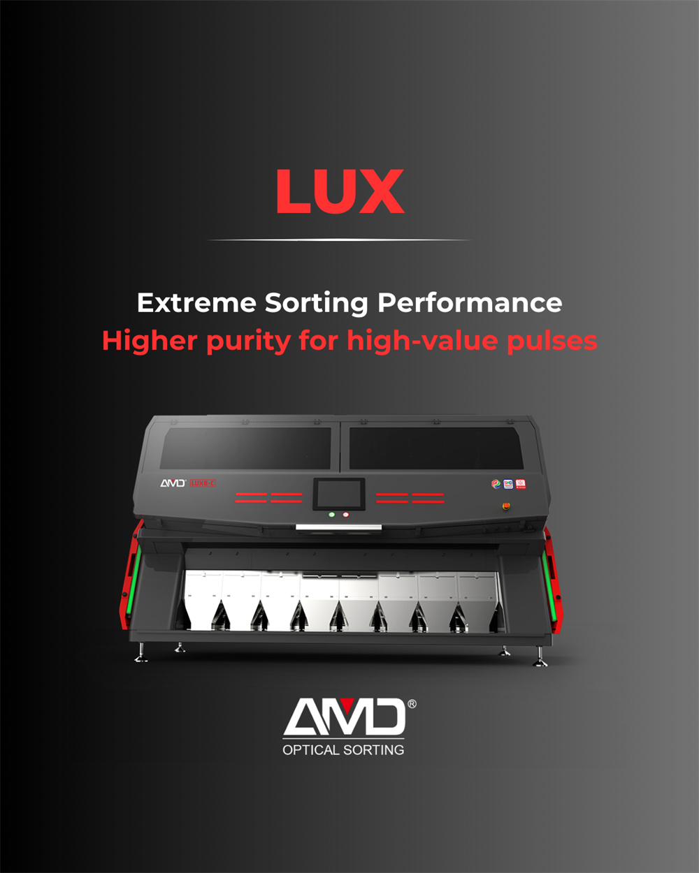 La série LUX représente la plateforme de tri optique nouvelle génération d'AMD Sorting, conçue pour les applications exigeant une pureté accrue, un contrôle qualité plus rigoureux et des performances stables à grande échelle. Grâce à son système optique avancé et à ses algorithmes intelligents, LUX établit une nouvelle référence en matière de tri d'impulsions.